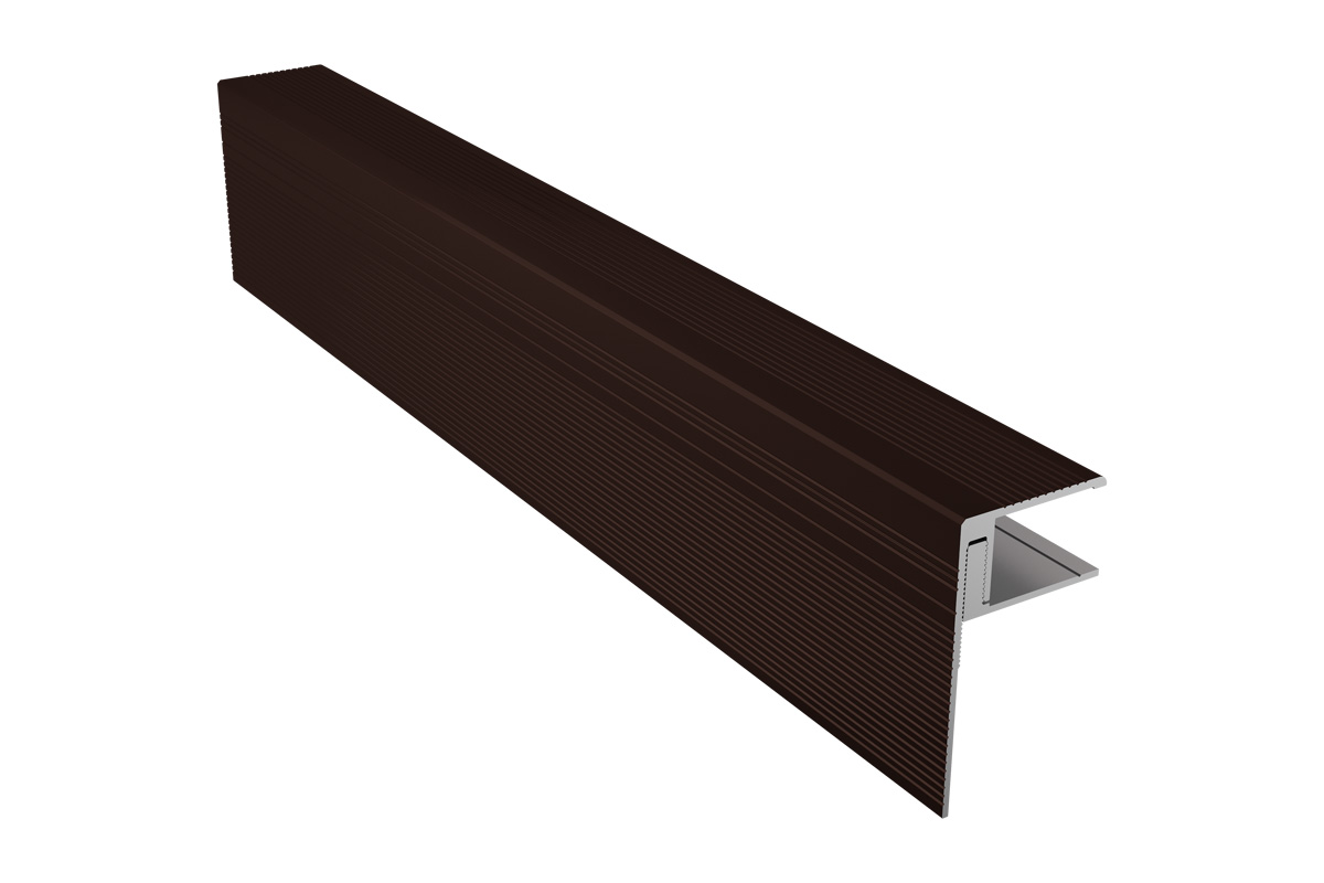 Выполненный из алюминия F-профиль предназначен для финишной отделки террасного покрытия. Данный элемент придаст законченный вид настилу и позволит подчеркнуть эстетику выбранного покрытия.
