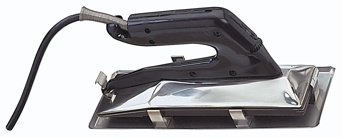 С контролем температуры. Мощность: 750 Вт. 4 позиции термостатической регулировки. Поставляется в металлическом кейсе с подставкой.