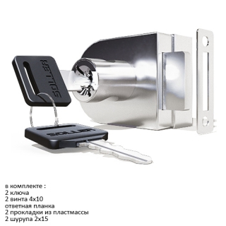 В комплекте : 2 ключа, ответная планка, 2 винта 4х10, 4 прокладки из пластмассы, 2 шурупа 2х15