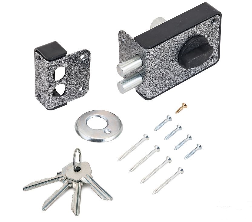 Замок накладной цилиндровый с вертушкой. Предназначен для установки на деревянные двери. Засов из двух цилиндрических ригелей диаметром 14 мм, с максимальным вылетом 25 мм. Удаление ключевого отверстия — 60 мм. Габариты замка — 100х75х24,5 мм. Комплектация — 4 ключей, запорная планка, накладка. Закрывание и открывание замка изнутри производится ручкой, снаружи ключом. Корпус из ударопрочного пластика со стальной пластиной.