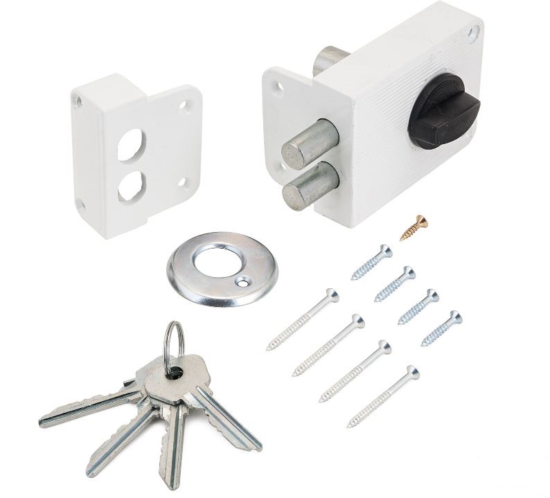 Замок накладной цилиндровый с вертушкой. Предназначен для установки на деревянные двери. Засов из двух цилиндрических ригелей диаметром 14 мм, с максимальным вылетом 25 мм. Удаление ключевого отверстия — 60 мм. Габариты замка — 100х75х24,5 мм. Комплектация — 4 ключей, запорная планка, накладка. Закрывание и открывание замка изнутри производится ручкой, снаружи ключом.