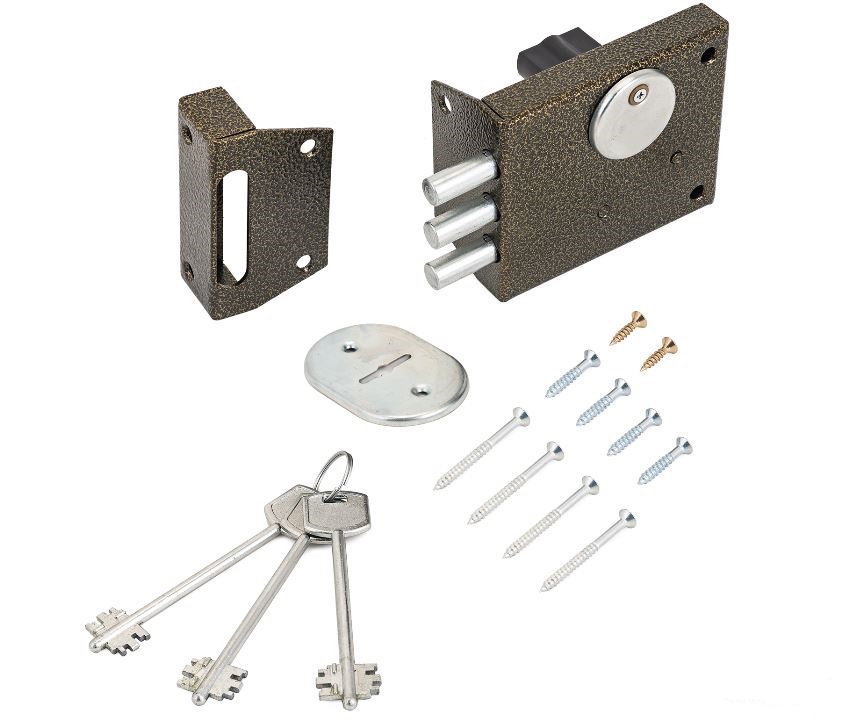 Замок накладной сувальдный. Предназначен для установки на деревянные двери. Засов из трех цилиндрических ригелей диаметром 11 мм, с максимальным вылетом 26 мм. Удаление ключевого отверстия — 55 мм. Габариты замка — 100х85х19 мм. Комплектация — 3 ключа, запорная планка, накладка.