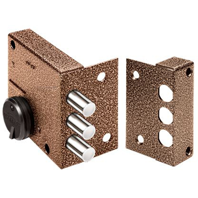 Замок накладной сувальдный. Предназначен для установки на деревянные двери. Засов из трех цилиндрических ригелей диаметром 12 мм, с максимальным вылетом 21,5 мм. Удаление ключевого отверстия — 53,5 мм. Количество оборотов ключа — 2. Габариты замка — 86х83х20 мм. Комплектация — 5 ключей, накладка, пластмассовая шторка, запорная коробка.