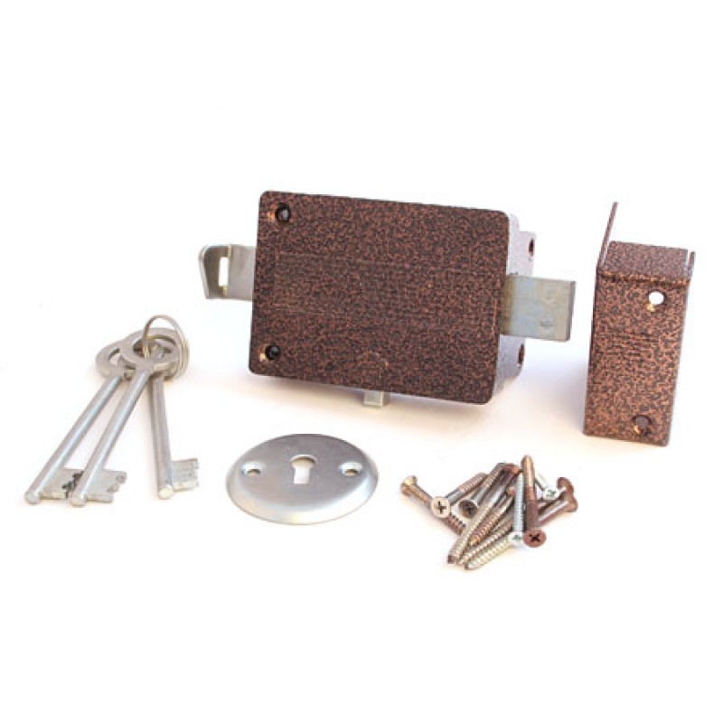 Замок накладной сувальдный с задвижкой. Предназначен для установки на деревянные двери. Засов прямоугольного сечения размерами 10х20 мм, с максимальным вылетом 26 мм. Удаление ключевого отверстия — 62 мм. Габариты замка — 100х72х24 мм. Комплектация — 3 ключа, запорная планка, накладка. Замок односторонний — изнутри ригель перемещается задвижкой с фиксатором.