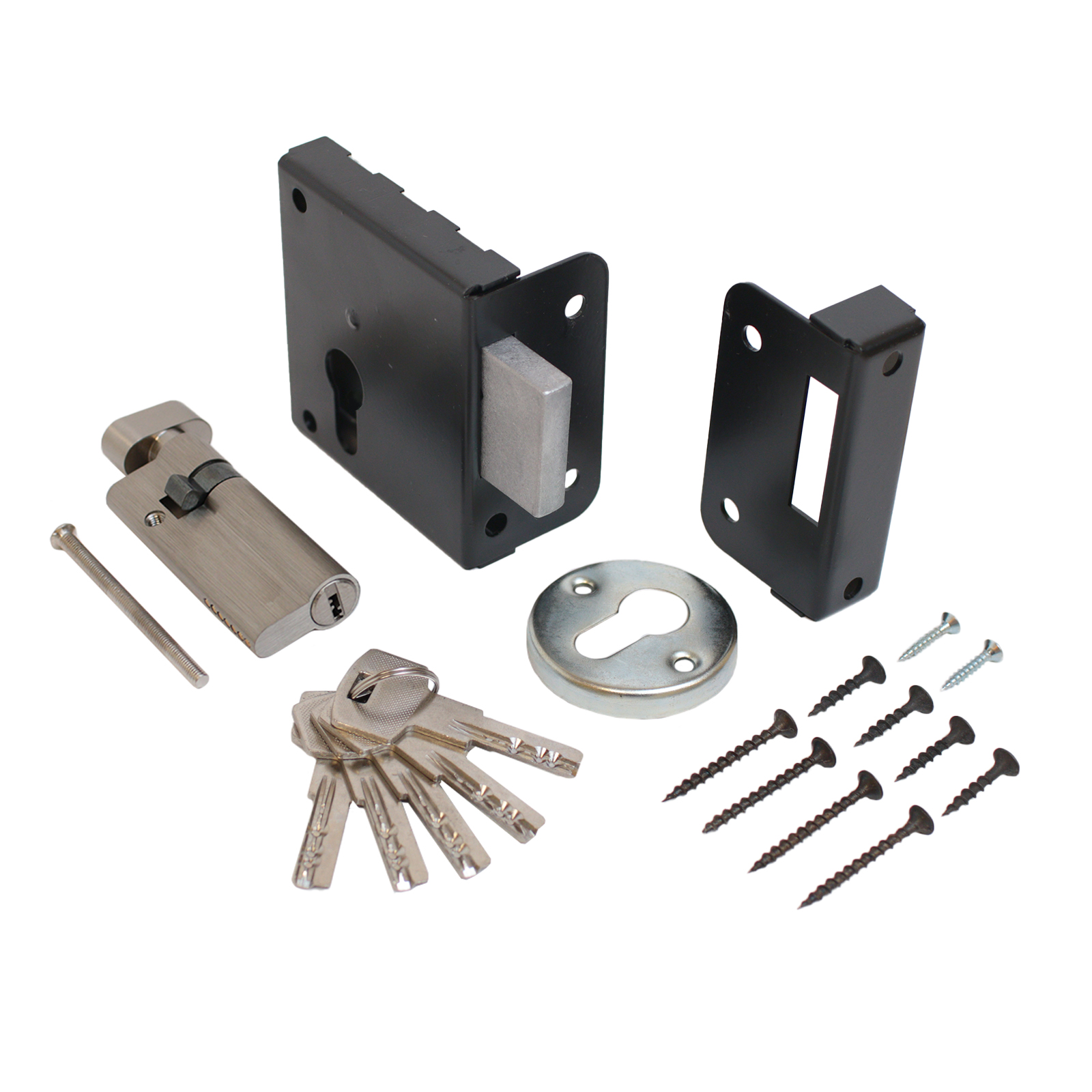 Замок накладной с усиленным цинковым цилиндровым механизмом. Предназначен для установки на деревянные и легкие металлические двери, Подходит для тамбурных дверей, т.к. вертушка не имеет фиксированных положений. Комплектация — 5 перфорированных ключей, запорная планка, накладка. Закрывание и открывание замка изнутри — вертушкой, снаружи — ключом.