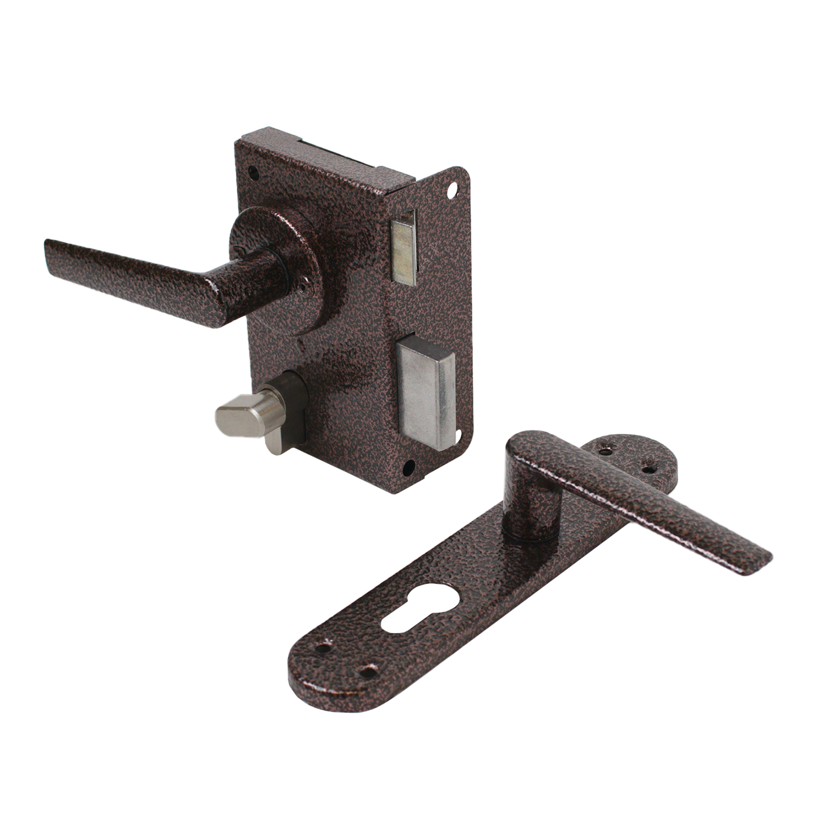 Замок накладной с ручками и цилиндровым механизмом. Предназначен для установки на деревянные и легкие металлические двери, Комплектация — цилиндр с 5 перфорированными ключами,ручки, запорная планка. Закрывание и открывание замка изнутри — вертушкой, снаружи — ключом.