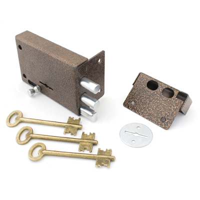 Замок накладной сувальдный с задвижкой. Предназначен для установки на деревянные двери. Замок имеет засов из двух цилиндрических ригелей диаметром 11 мм, с максимальным вылетом 22 мм, и задвижку с вылетом 22 мм. Удаление ключевого отверстия — 62 мм. Габариты замка — 126х80х23 мм. Комплектация — 3 ключа, торцевая планка, накладка.