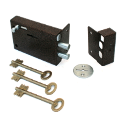 Замок накладной сувальдный с задвижкой. Предназначен для установки на деревянные двери. Замок имеет засов из двух цилиндрических ригелей диаметром 11 мм, с максимальным вылетом 22 мм, и задвижку с вылетом 22 мм. Удаление ключевого отверстия — 62 мм. Габариты замка — 126х80х23 мм. Комплектация — 3 ключа, торцевая планка, накладка.