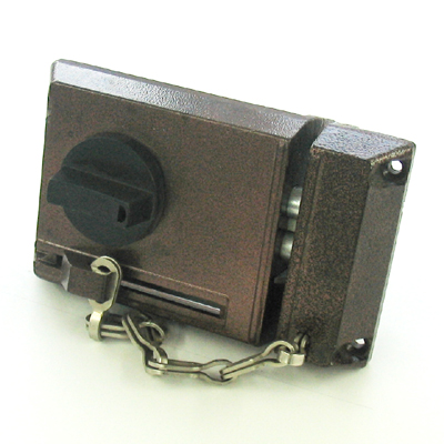 Замок накладной дисковый с вертушкой и дверной цепочкой. Предназначен для установки на деревянные двери. Засов из двух цилиндрических ригелей диаметром 11 мм, с максимальным вылетом 22 мм. Удаление ключевого отверстия — 60 мм. Габариты замка — 100х82х23 мм. Комплектация — 3 ключа, торцевая планка. Автоматическое запирание замка на полный выход засова. Закрывание и открывание изнутри производится вертушкой, снаружи ключом. Цвет корпуса замка — медный антик (полимерное покрытие).