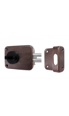 Замок накладной дисковый с вертушкой. Предназначен для установки на деревянные двери. Засов из двух цилиндрических ригелей диаметром 11 мм, с максимальным вылетом 20 мм. Удаление ключевого отверстия — 60 мм. Габариты замка — 92х72х23 мм. Комплектация — 3 ключа, торцевая планка. Автоматическое запирание замка на полный выход засова. Закрывание и открывание изнутри производится вертушкой, снаружи ключом. Цвет корпуса замка — медный антик (полимерное покрытие).