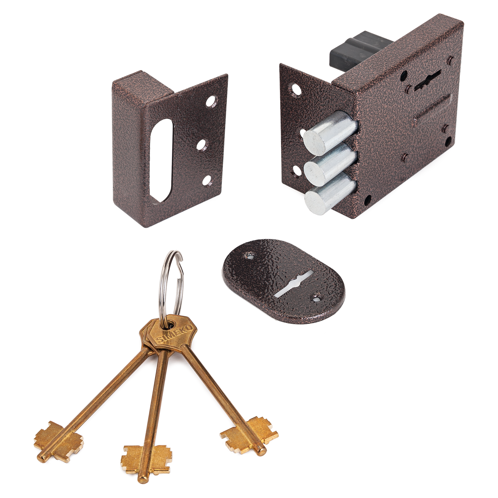 Замок накладной сувальдный. Предназначен для установки на деревянные двери. Засов из трех цилиндрических ригелей диаметром 14 мм, с максимальным вылетом 22 мм. Удаление ключевого отверстия — 57 мм. Габариты замка — 90х77х18 мм. Комплектация — 3 ключа, накладка, торцевая планка, пластиковая направляющая под ключ.