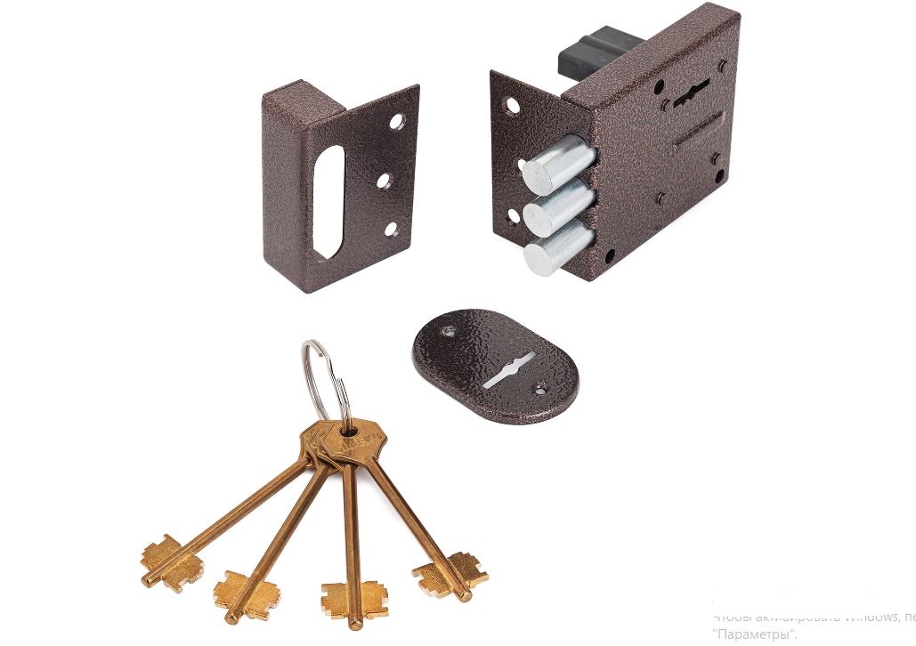 Замок накладной сувальдный. Предназначен для установки на деревянные двери. Засов из трех цилиндрических ригелей диаметром 14 мм, с максимальным вылетом 22 мм. Удаление ключевого отверстия — 57 мм. Габариты замка — 90х77х18 мм. Комплектация — 3 ключа, накладка, торцевая планка, пластиковая направляющая под ключ.