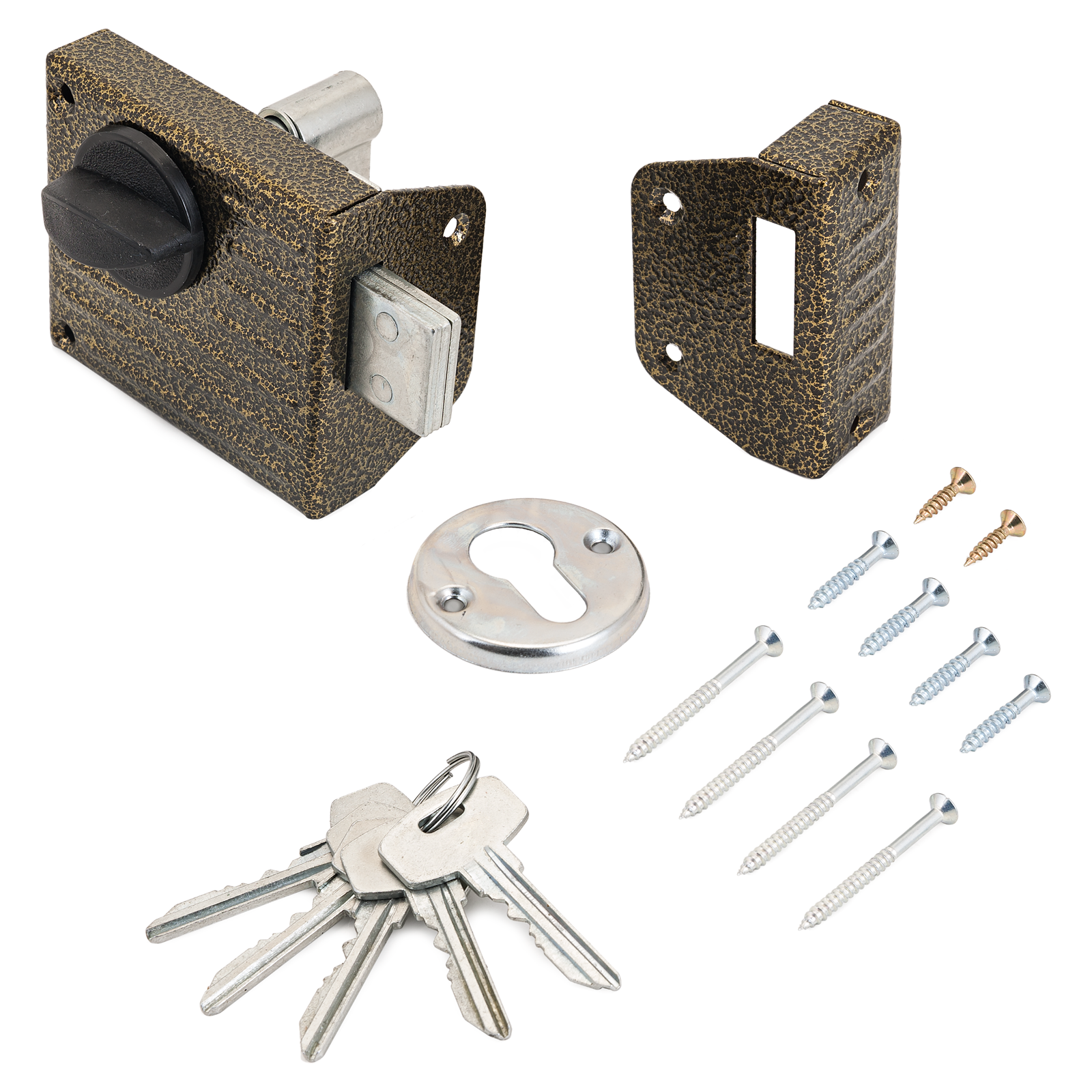 Замок накладной цилиндровый с вертушкой. Предназначен для установки на деревянные двери. Засов прямоугольного сечения размерами 9х28, с максимальным вылетом 24(23) мм. Удаление ключевого отверстия — 55 мм. Габариты замка — 90,5х78х20 мм. Комплектация — 4 ключа, запорная планка, накладка. Закрывание и открывание замка изнутри производится ручкой, снаружи ключом