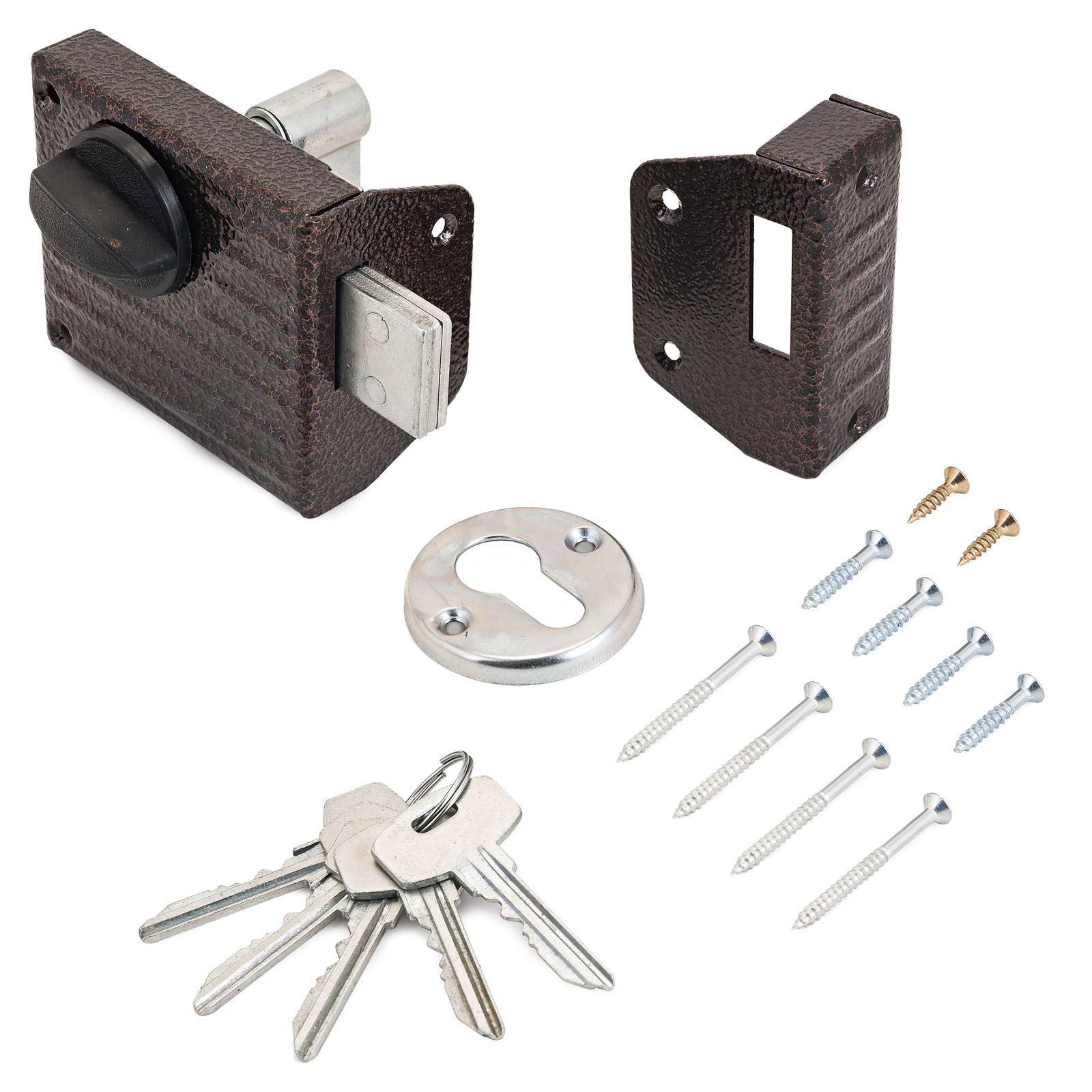 Замок накладной цилиндровый с вертушкой. Предназначен для установки на деревянные двери. Засов прямоугольного сечения размерами 9х28, с максимальным вылетом 24(23) мм. Удаление ключевого отверстия — 55 мм. Габариты замка — 90,5х78х20 мм. Комплектация — 4 ключа, запорная планка, накладка. Закрывание и открывание замка изнутри производится ручкой, снаружи ключом