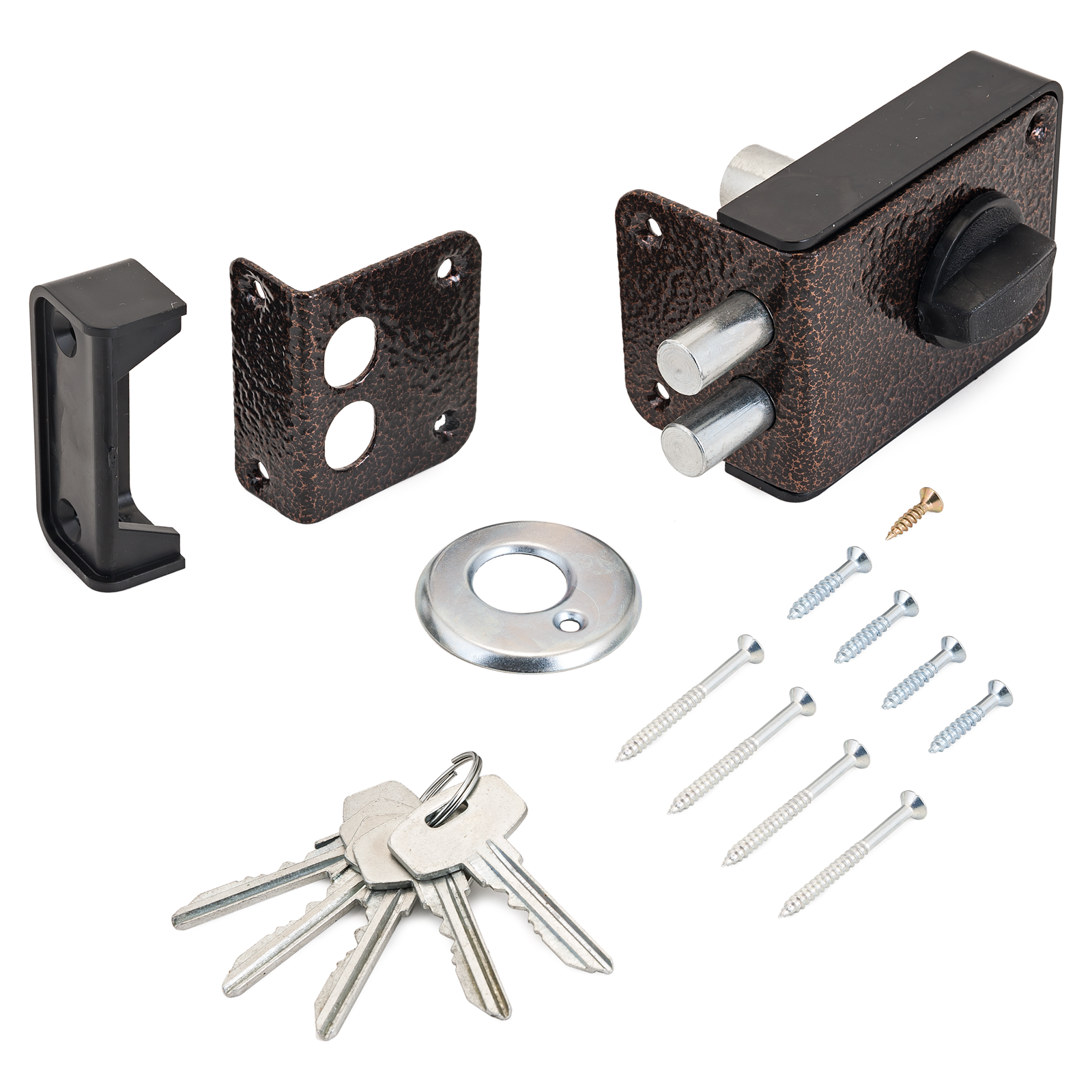 Замок накладной цилиндровый с вертушкой. Предназначен для установки на деревянные двери. Засов из двух цилиндрических ригелей диаметром 14 мм, с максимальным вылетом 25 мм. Удаление ключевого отверстия — 60 мм. Габариты замка — 100х75х24,5 мм. Комплектация — 4 ключа, запорная планка, накладка. Закрывание и открывание замка изнутри производится ручкой, снаружи ключом. Корпус из ударопрочного пластика со стальной пластиной.