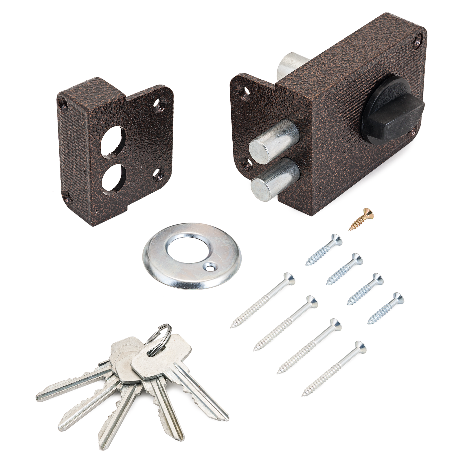 Замок накладной цилиндровый с вертушкой. Предназначен для установки на деревянные двери. Засов из двух цилиндрических ригелей диаметром 14 мм, с максимальным вылетом 25 мм. Удаление ключевого отверстия — 60 мм. Габариты замка — 99х75х24 мм. Комплектация — 4 ключа, запорная планка, накладка. Закрывание и открывание замка изнутри производится ручкой, снаружи ключом.