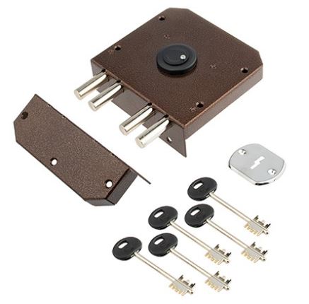 Замок накладной сувальдный. Предназначен для установки на металлические двери правого и левого открывания. Засов из четырех цилиндрических ригелей диаметром 14 мм, с максимальным вылетом 40 мм. Удаление ключевого отверстия — 64 мм.