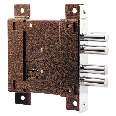 Замок накладной сувальдный. Предназначен для установки на металлические двери. Засов из четырех цилиндрических ригелей диаметром 15,7 мм, с максимальным вылетом 42 мм. Удаление ключевого отверстия — 92,5 мм. Габариты замка — 145х127х25 мм. Комплектация — 5 ключей, торцевая планка, накладка. Замок универсальный, может быть как врезным, так и накладным.