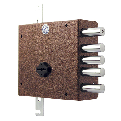 Замок накладной сувальдный с тягами. Предназначен для установки на металлические двери. Засов из пяти цилиндрических ригелей диаметром 15,7 мм, с максимальным вылетом 42 мм. Удаление ключевого отверстия — 83 мм. Габариты замка — 145х157х31 мм. Комплектация — 5 ключей, торцевая планка, накладка. В одном из ригелей расположен закаленный стальной стержень, обеспечивающий надежную защиту от перепиливания.