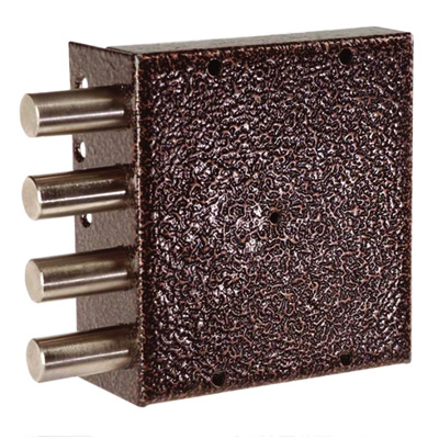 Замок накладной сувальдный. Предназначен для установки на металлические двери. Засов из четырех цилиндрических ригелей диаметром 18,5 мм, с максимальным вылетом 40 мм. Удаление ключевого отверстия — 64 мм. Количество полуоборотов ключа — 4. Габариты замка — 135х146х32,5 мм. Односторонний замок — открывается и закрывается только с внешней стороны. Защита от вскрытия замка отмычкой, защита от высверливания стойки ригеля и защита от вскрытия методом проворота.