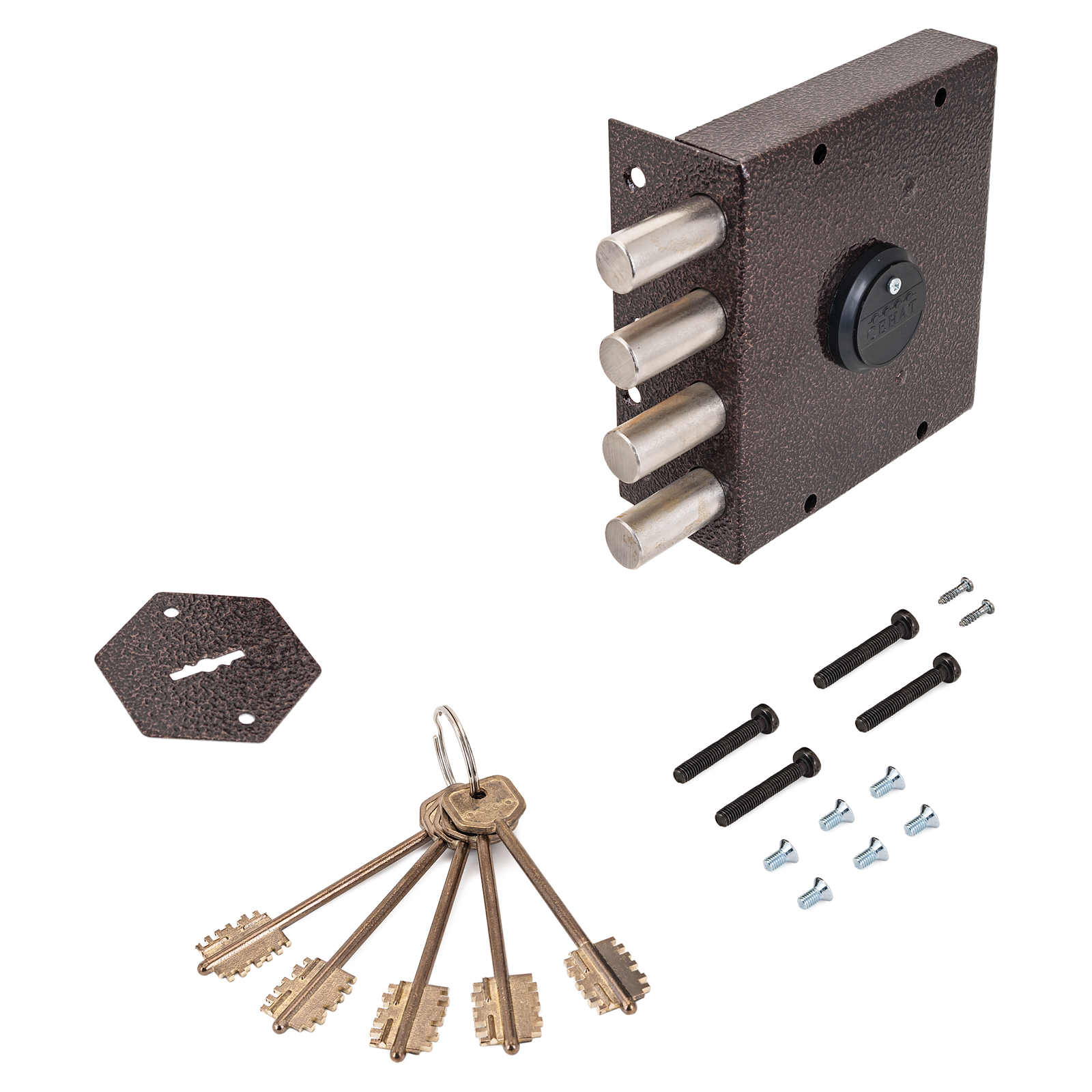 Замок накладной сувальдный. Предназначен для установки на металлические двери. Засов из четырех цилиндрических ригелей диаметром 18 мм, с максимальным вылетом 40 мм. Удаление ключевого отверстия — 64 мм. Количество полуоборотов ключа — 4. Габариты замка — 135х146х32,5 мм. Защита от вскрытия замка отмычкой, защита от высверливания стойки ригеля и защита от вскрытия методом проворота.