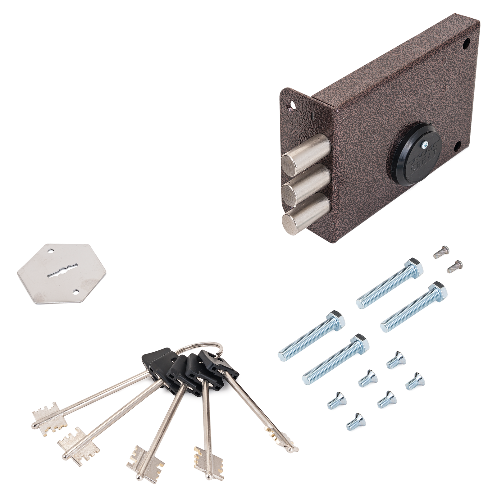 Открывается и закрывается с наружной и внутренней сторон 2 полными оборотами (на 4 фиксируемых положения) комплектного ключа. Засов изготовлен из 3-х стальных стержней круглого сечения. Имеет накладку с внутренней стороны на замочной скважине и пластмассовую направляющую под ключ. Базовая комплектация предусматривает защиту от вскрытия замка отмычкой, защиту от высверливания стойки ригеля и защиту от вскрытия методом проворота.