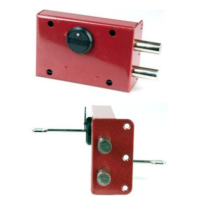Замок накладной сувальдный. Предназначен для установки на металлические двери. Засов из двух цилиндрических ригелей диаметром 18,5 мм, с максимальным вылетом 40 мм. Удаление ключевого отверстия — 88 мм. Количество полуоборотов ключа — 4. Габариты замка — 166х110х34 мм. Ключевые скважины не являются сквозными и расположены на разных высотных уровнях с наружной и внутренней сторон. Защита от вскрытия замка отмычкой, защита от высверливания стойки ригеля и защита от вскрытия методом проворота.