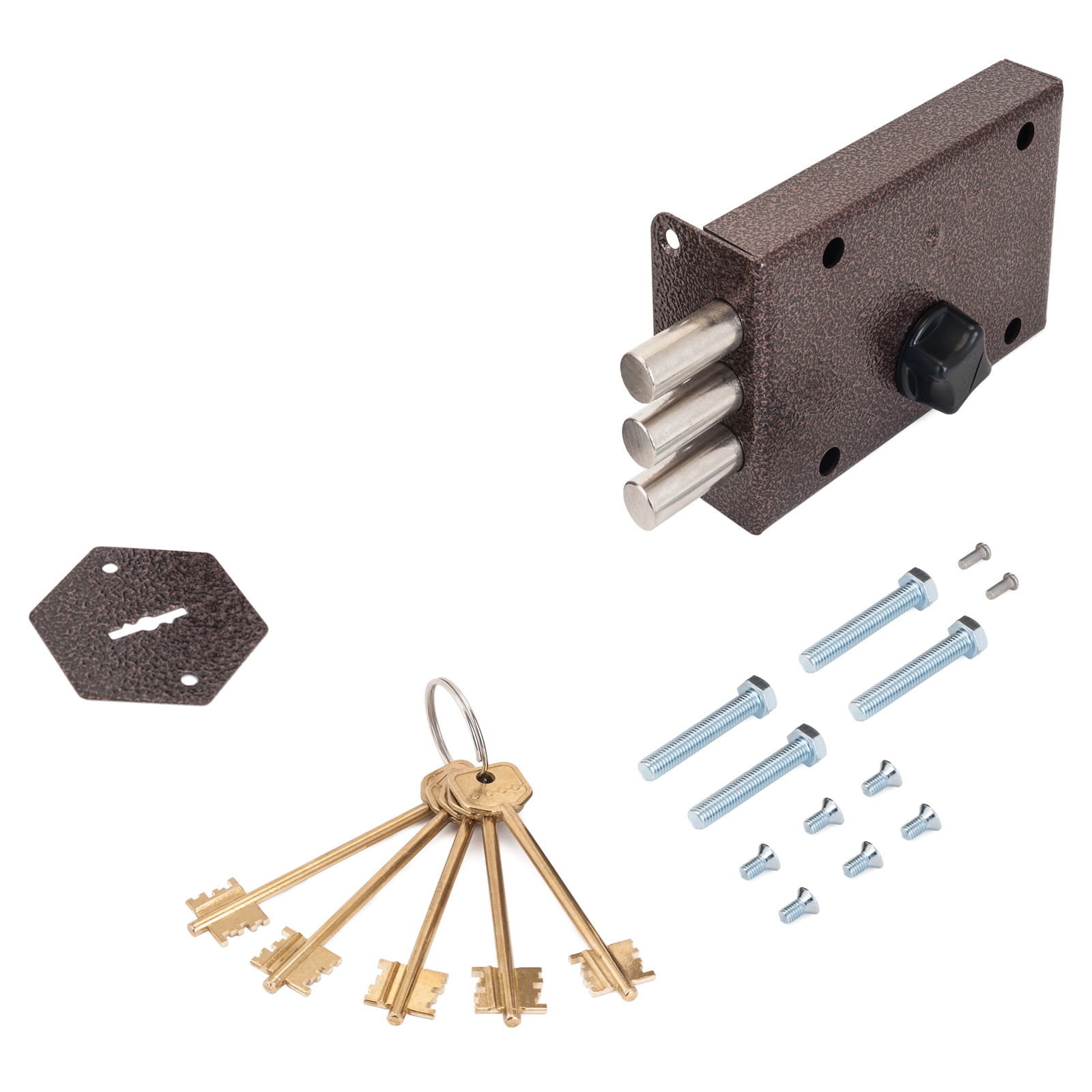 Открывается и закрывается с наружной стороны двумя полными оборотами (на 4 фиксируемых положения) комплектного ключа, а с внутренней стороны ручкой постоянного ключа. При запирании на 1 или 3 фиксируемых положения открыть замок с наружной стороны невозможно. Засов изготовлен из 3-х вращающихся стальных стержней круглого сечения. Имеет пластмассовую направляющую под ключ. Базовая комплектация предусматривает защиту от вскрытия замка отмычкой, защиту от высверливания стойки ригеля и защиту от вскрытия методом проворота. Дополнительная комплектация предполагает: — установку каленой вращающейся шайбы на крышке замка, дополнительно предохраняющей от высверливания стойки ригеля; — плоскую запорную планку. Класс замка — 4. Количество секретов — 1 000 000. Выход засова — 40 мм. Диаметр стержня ригеля — 18 мм.