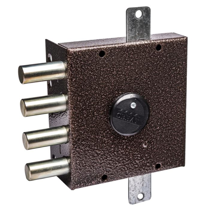 Открывается и закрывается с наружной и внутренней сторон двумя полными оборотами (на 4 фиксируемых положения) комплектного ключа. Засов изготовлен из 4-х стальных стержней круглого сечения, приваренных к пластине ригеля. Базовая комплектация предусматривает защиту от вскрытия замка отмычкой, защиту от высверливания стойки ригеля и защиту от вскрытия методом проворота. Имеет накладку с внутренней стороны на замочной скважине и пластмассовую направляющую под ключ.