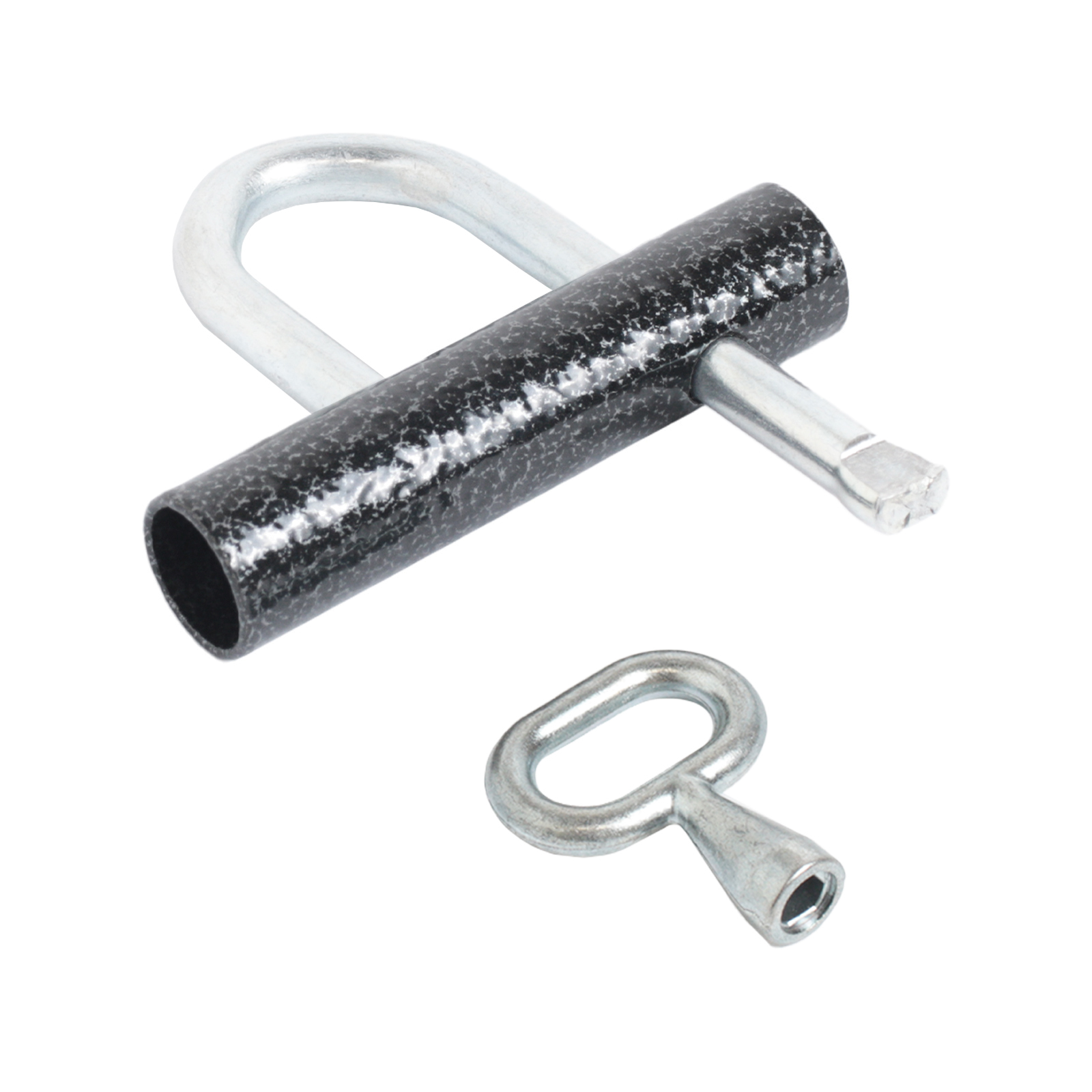 Отличительными особенностями данного замка являются простота и надежность конструкции, которая достигается благодаря минимальному количеству элементов замка, дужка фиксируется винтовым элементом. Замок снабжен компактным трехгранным ключом.