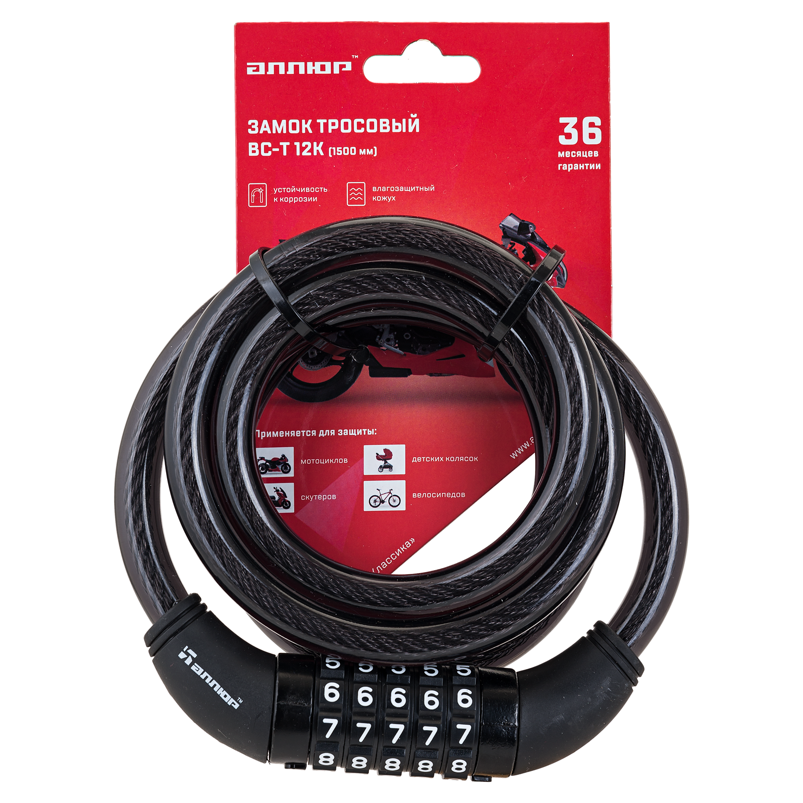 Всепогодный тросовый кодовый замок предназначен для защиты велосипедов, самокатов, колясок, а также для запирания ворот и решёток. Материал корпуса — сталь покрыта пластиком. Стальной трос с защитным ПВХ-покрытием (12мм — диаметр, 1500мм — длина). Секретность: 5 кодовых ячеек по 10 цифр.