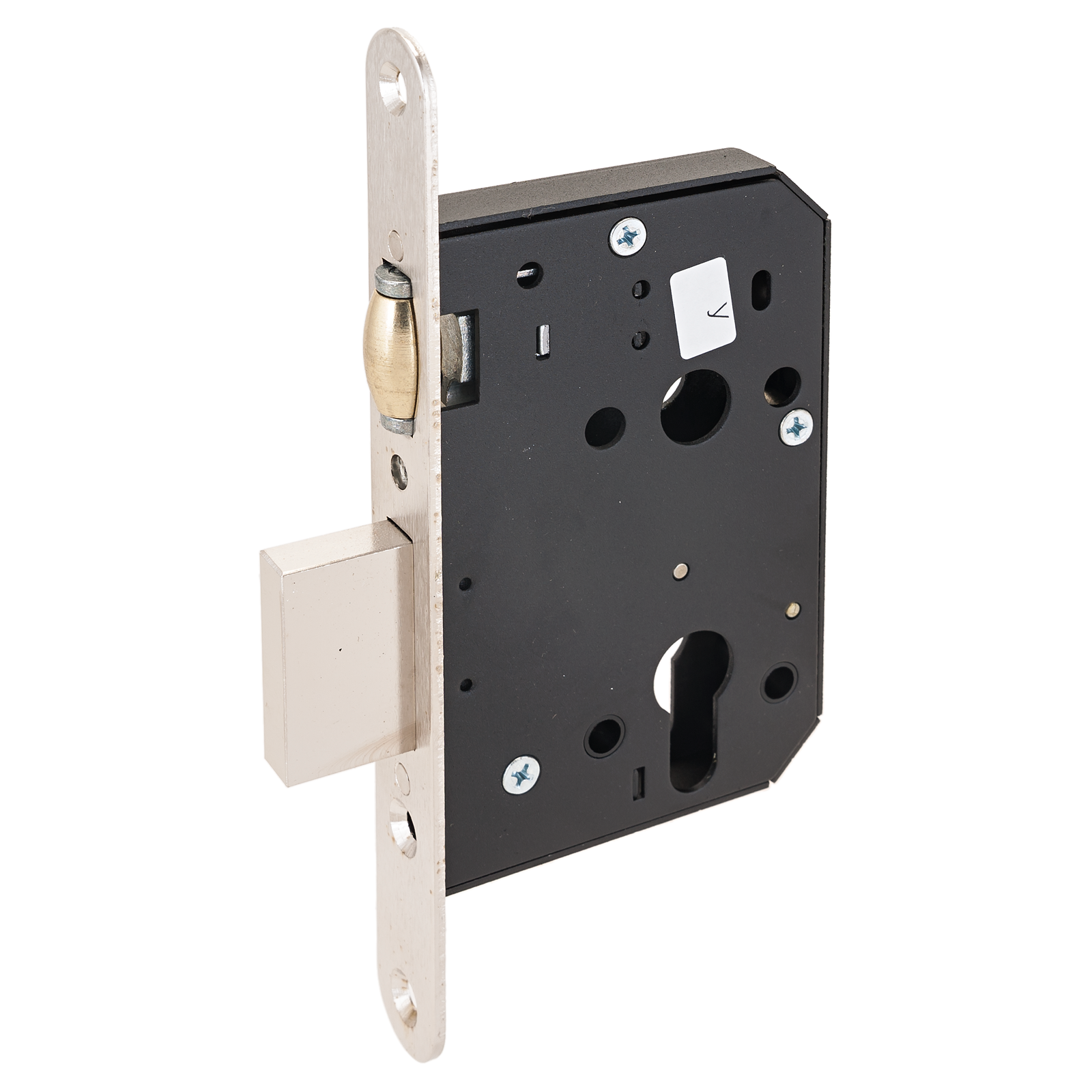 Замок врезной цилиндровый с роликовой защелкой, без механизма секрета. Предназначен для установки в деревянные и металлические двери.