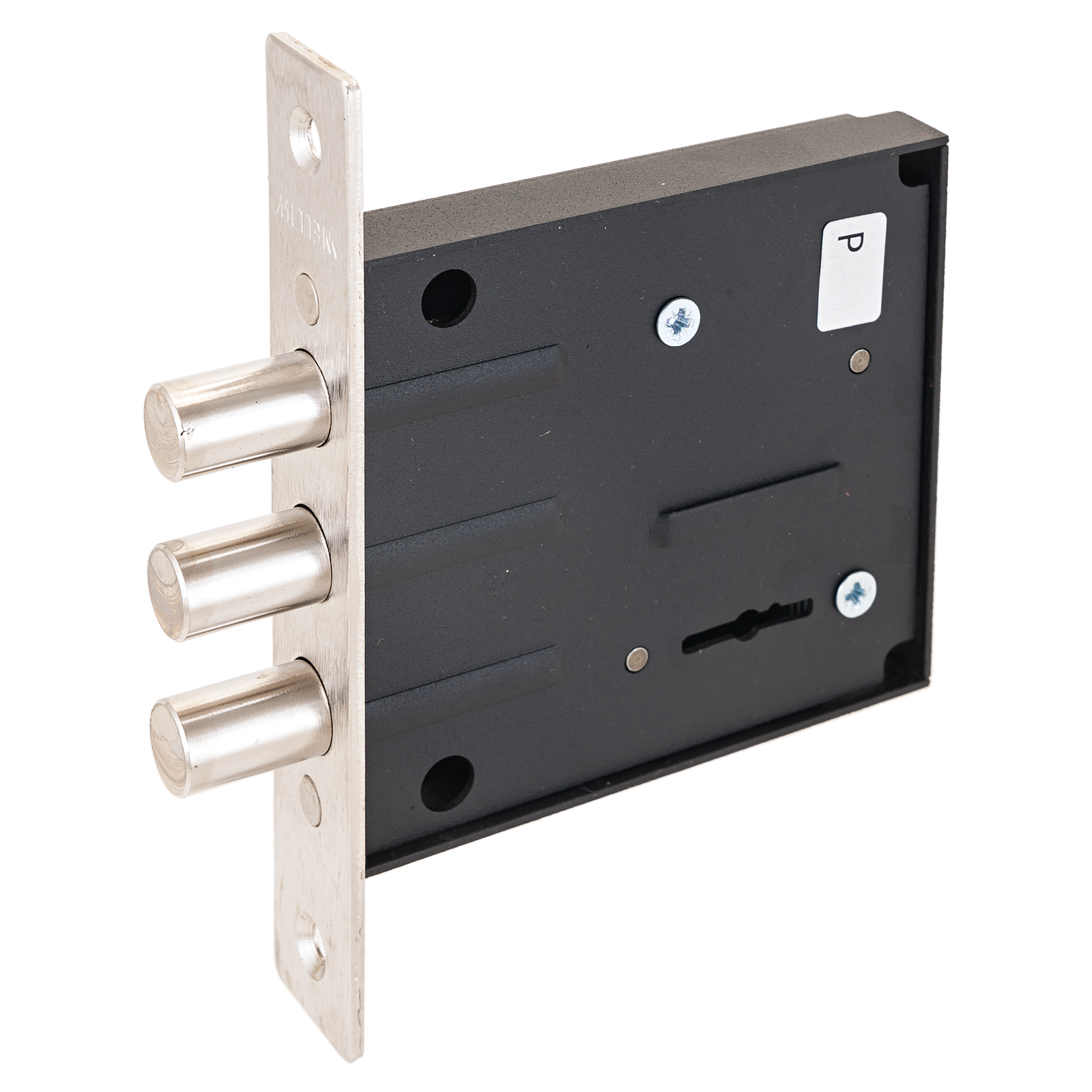 Три цилиндрических ригеля диаметром 13,5мм, вылет 25мм. Удаление ключевого отверстия 70мм. Стальная торцевая планка, покрытие — никель, ширина планки 25мм. 5 ключей.