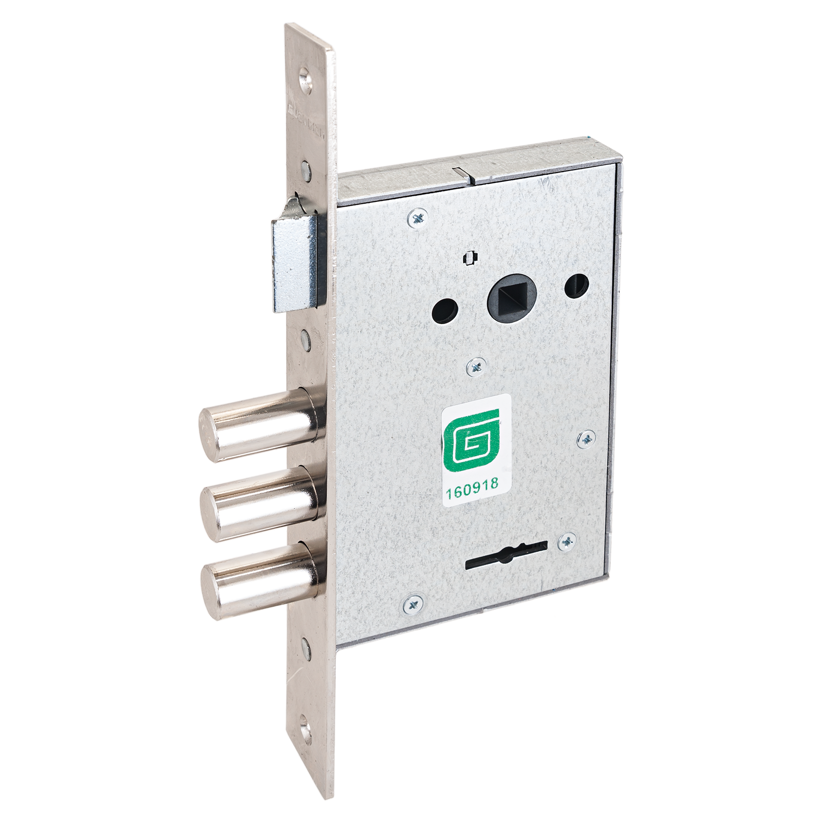 Три цилиндрических ригеля, диаметром 13,5мм, вылет 26мм. Межосевое расстояние 77мм. Удаление ключевого отверстия 50мм. Стальная торцевая планка, покрытие — никель, ширина планки 26мм. 4ключа.
