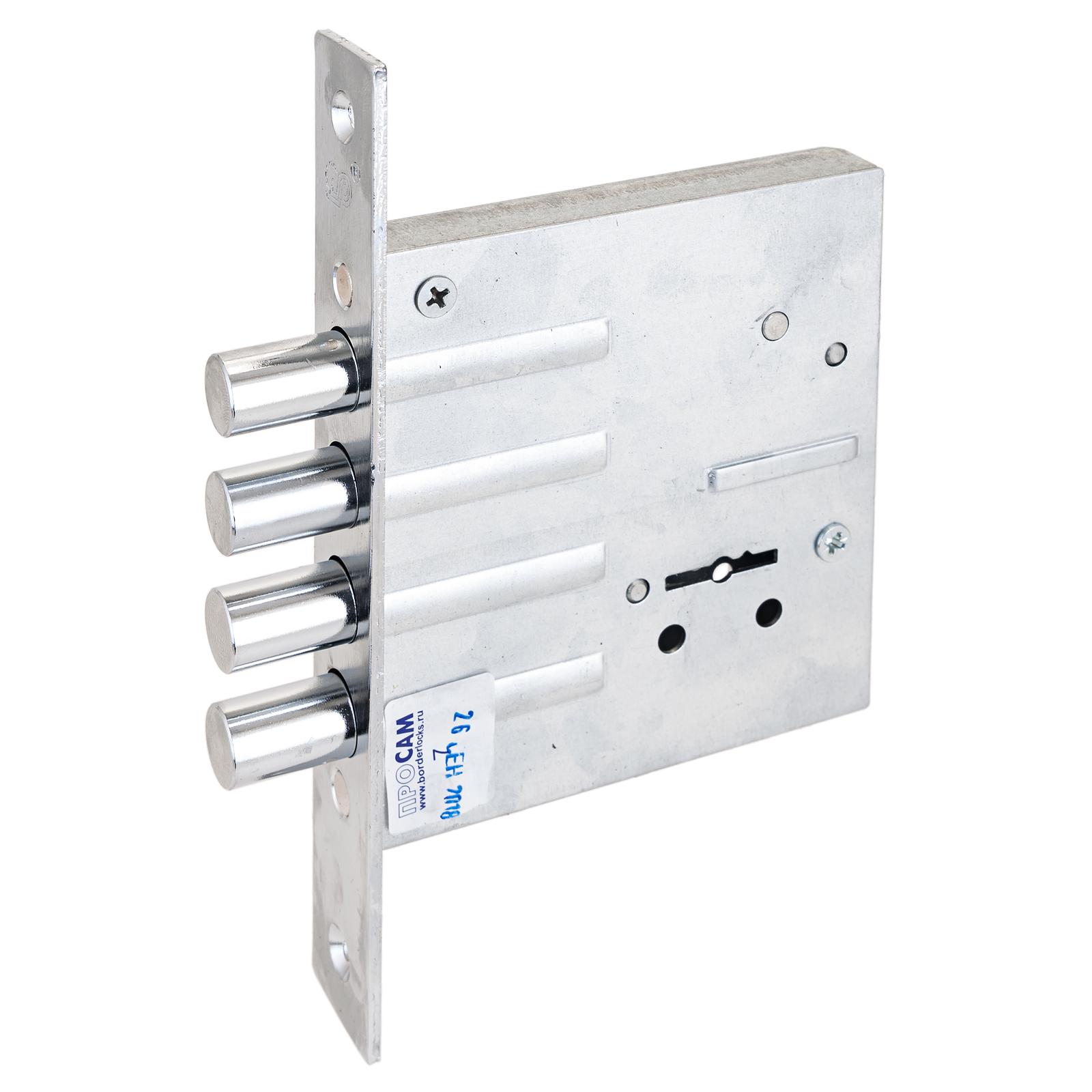 Четыре цилиндрических ригеля диаметром 13,7мм, вылет 22мм. Удаление ключевого отверстия 69мм. Стальной оцинкованный корпус. Ширина торцевой планки 25мм. Заявленная секретность 250 000 кодовых комбинаций. Замок имеет защиту от высверливания. Изготовлен из высокопрочных материалов.