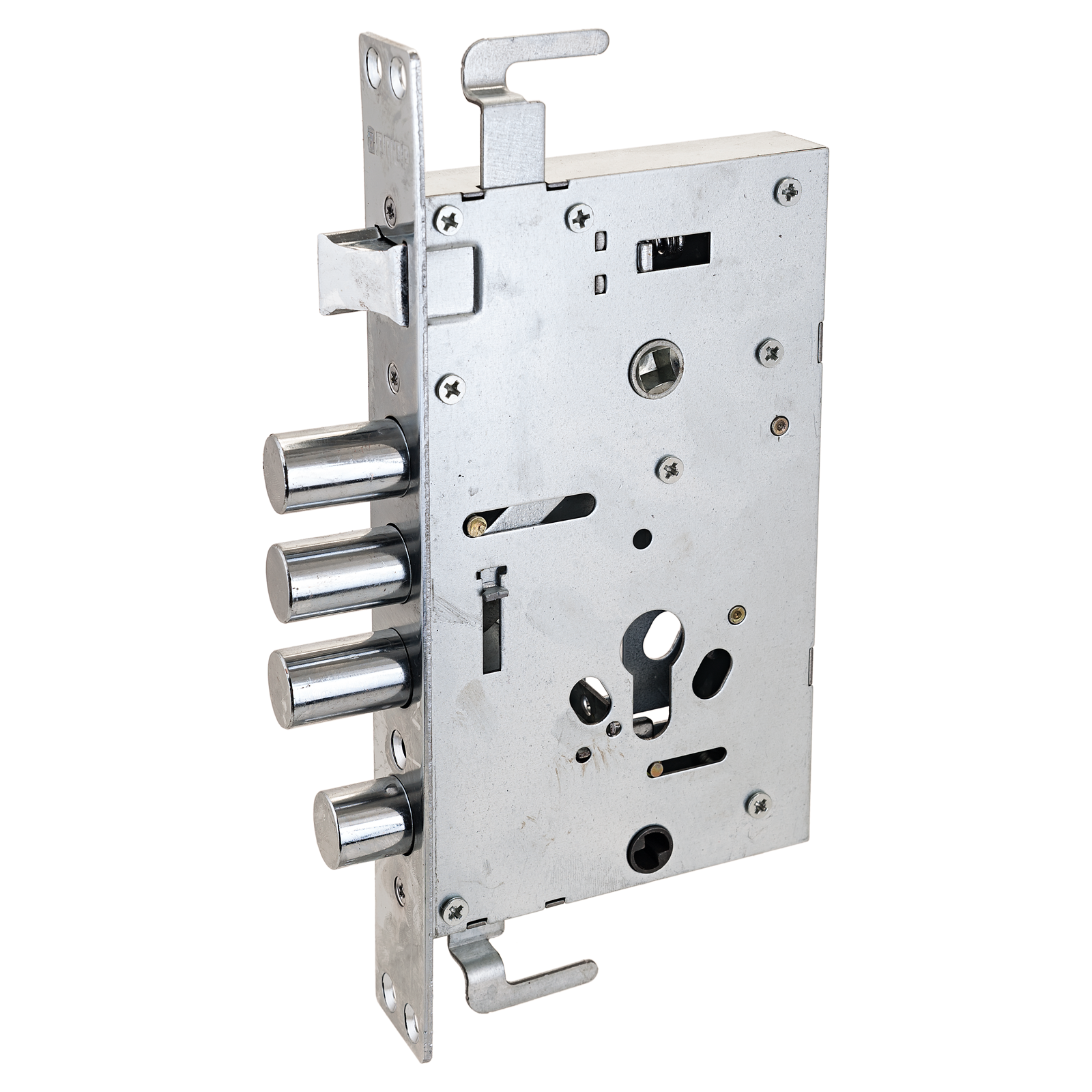 Засов из трех стальных цилиндрических ригелей, диаметром 18 мм, с максимальным вылетом 30 мм. Оцинкованный стальной корпус.