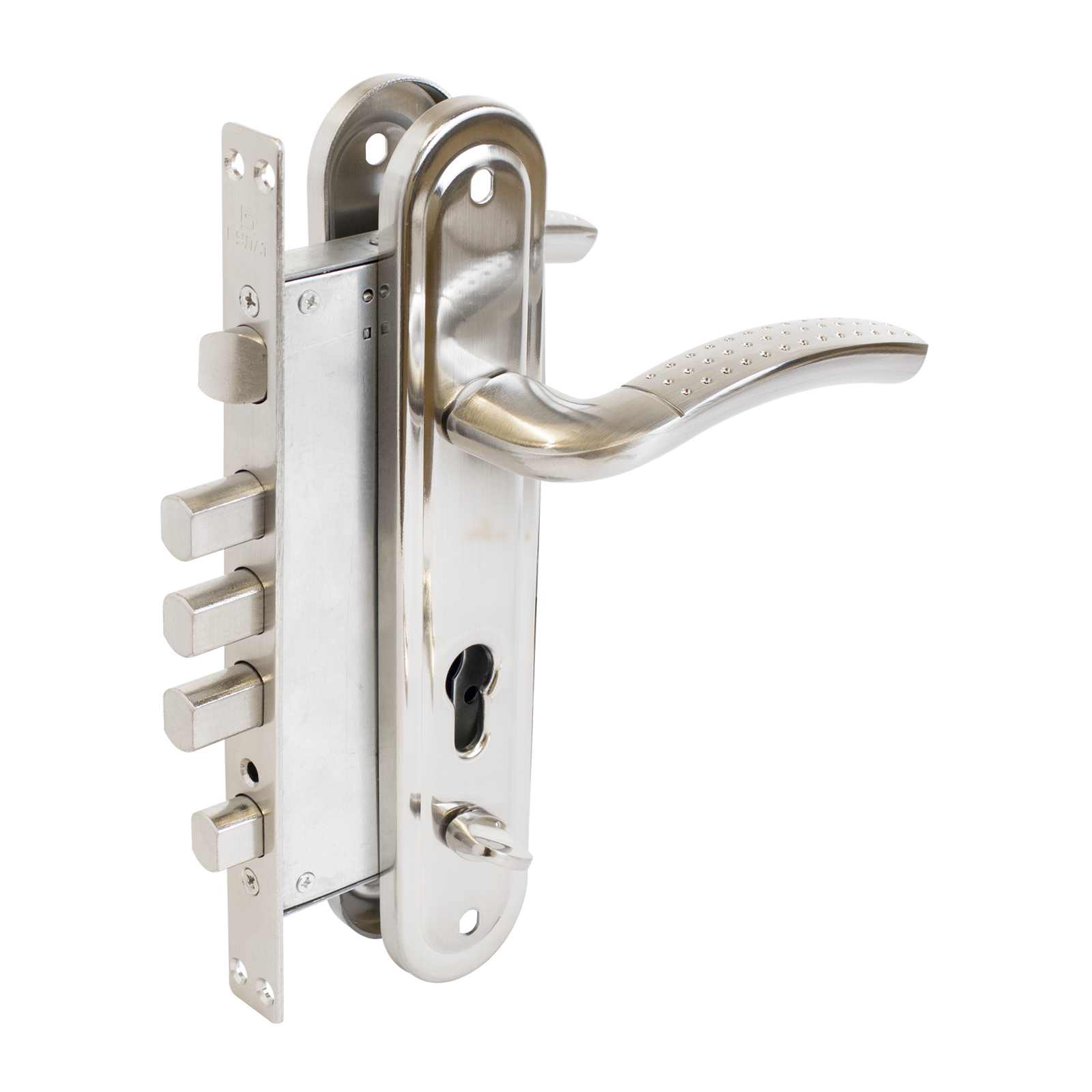 Засов из трех цилиндрических ригелей диаметром 18 мм и ночной задвижкой, с максимальным вылетом 24 мм.