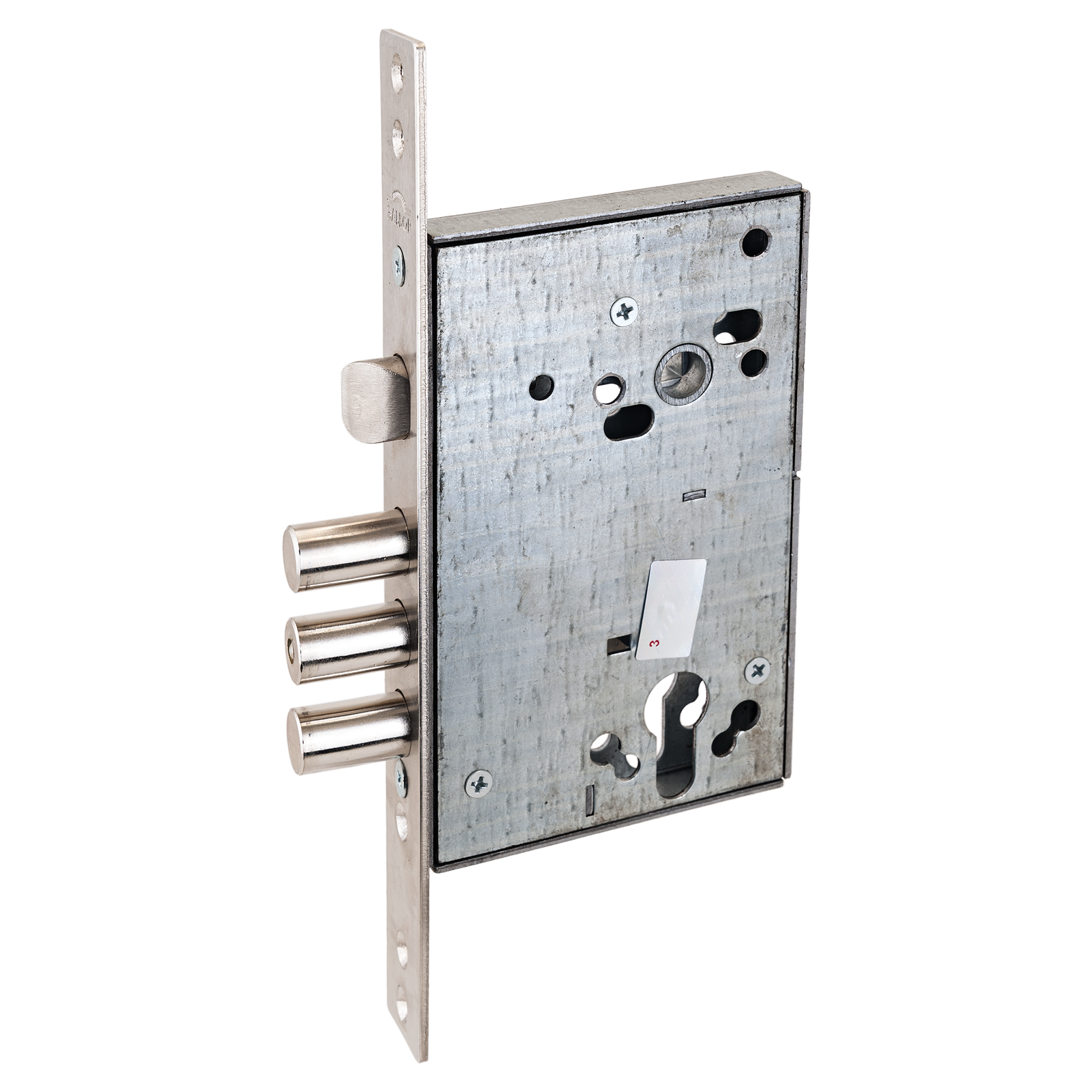 Замок врезной цилиндровый с защелкой для металлических дверей, без механизма секрета. Замок имеет засов из трех цилиндрических ригелей диаметром 16 мм, с максимальным вылетом 26 мм, и универсальную защелку диаметром 19,6 м. Удаление ключевого отверстия 67,5 мм. Межосевое расстояние 85 мм. Количество оборотов ключа — 2. Габариты замка — 100х156,5х22 мм. Комплектация — съемная торцевая планка, комплект накладок. В одном из ригелей расположен закаленный стальной стержень, обеспечивающий надежную защиту от перепиливания.