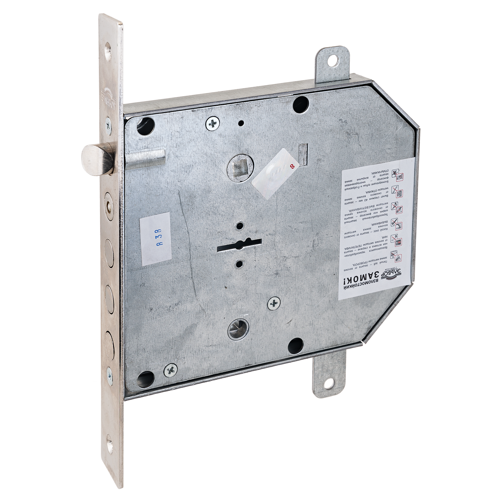 Замок врезной сувальдный с защелкой, задвижкой и тягами. Предназначен для металлических дверей. Замок имеет засов из четырех цилиндрических ригелей диаметром 14 мм, с максимальным вылетом 40,4 мм, защелку диаметром 16 мм и задвижку диаметром 14 мм и вылетом 21,5 мм. Удаление ключевого отверстия 68 мм. Межосевое расстояние 42 мм (до защелки) и 47 мм (до задвижки). Количество оборотов ключа — 4. Габариты замка — 137,5х152х20 мм. Комплектация — 5 ключей, съемная торцевая планка, комплект накладок. В одном из ригелей расположен закаленный стальной стержень, обеспечивающий надежную защиту от перепиливания. Защита от криминального и силового взлома, высверливания, выдавливания.