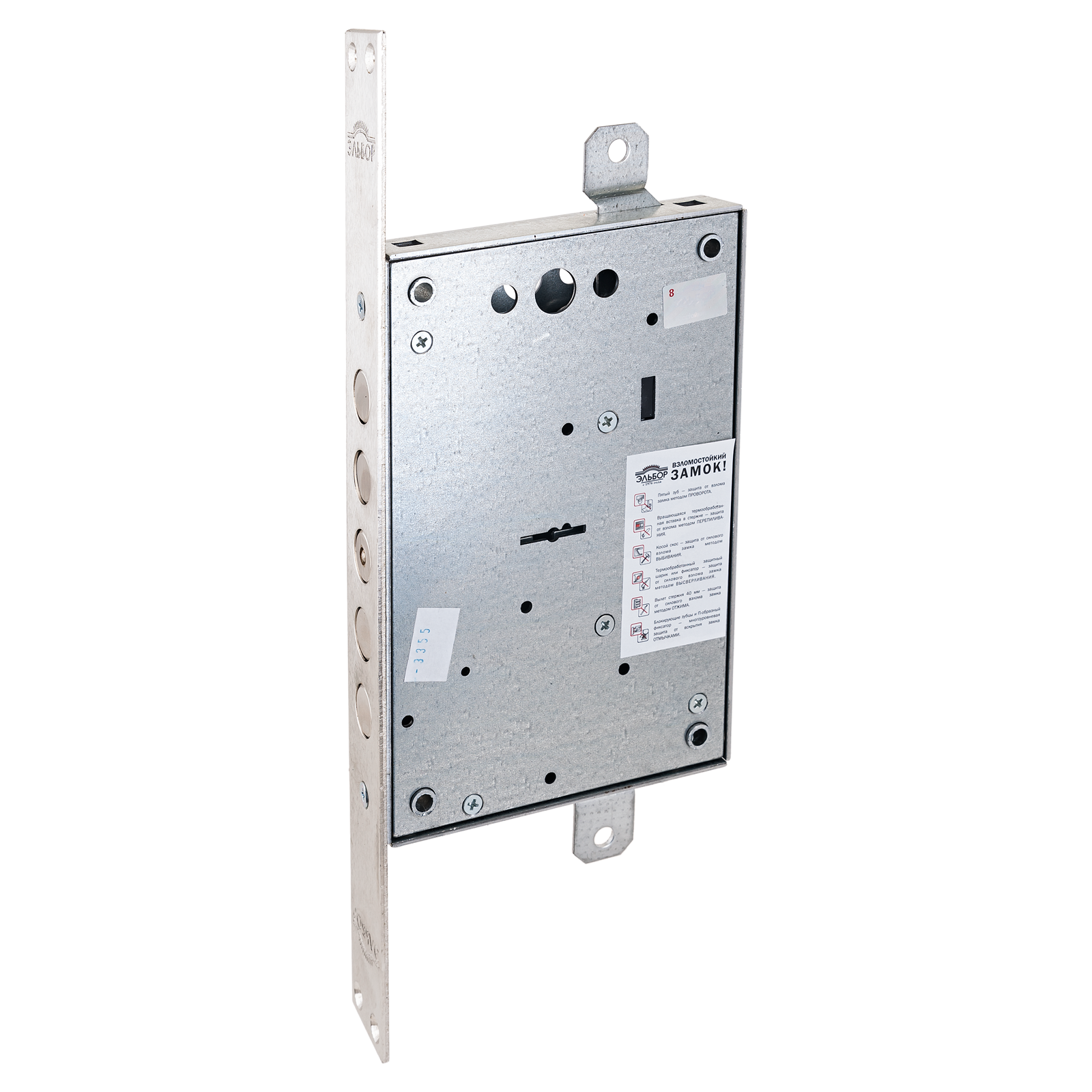 Замок врезной сувальдный с тягами для металлических дверей. Замок имеет засов из пяти цилиндрических ригелей диаметром 18 мм, с максимальным вылетом 40 мм, и тяги с вылетом 20 мм. Удаление ключевого отверстия 66 мм. Количество оборотов ключа — 4. Габариты замка — 139х206х30 мм. Комплектация — 5 ключей, съемная торцевая планка, комплект пласмассовых вкладышей для комбинированных накладок, комплект накладок из полированной нержавеющей стали. В одном из ригелей расположен закаленный стальной стержень, обеспечивающий надежную защиту от перепиливания. Отсутствие легкосплавных или пластиковых деталей делает замок пожароустойчивым.