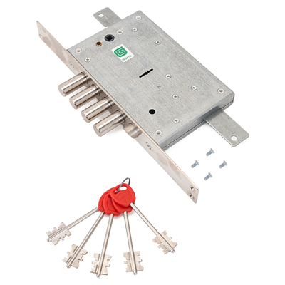 Замок врезной сувальдный с защелкой и тягами для металлических дверей. Замок имеет засов из четырех цилиндрических ригелей из стали диаметром 18мм, с максимальным вылетом 37,7мм, и тяги с вылетом 19мм. Удаление ключевого отверстия 63мм. Межосевое расстояние 85мм. Толщина полотна двери: 40-75 мм. Количество оборотов ключа – 4. Габариты замка — 206х136х28,5 мм. Комплектация — 5 ключей, съемная торцевая планка. Переворот защелки выполняется без разборки замка.
