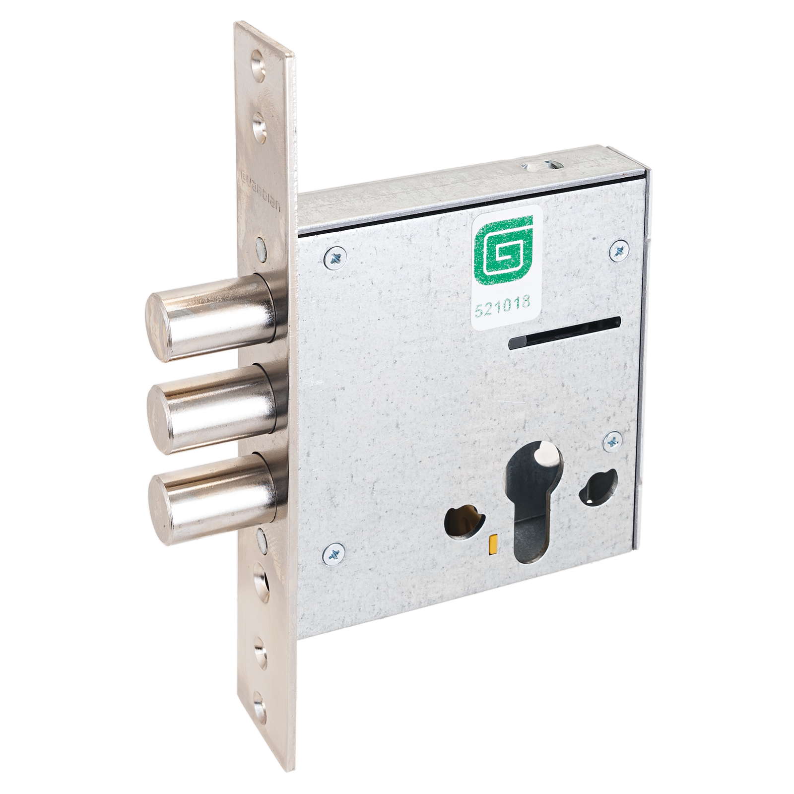 Три цилиндрических ригеля, диаметром 15,8мм, вылет 26мм. Удаление ключевого отверстия 65мм. Стальная торцевая планка, покрытие — никель, ширина планки 30мм.