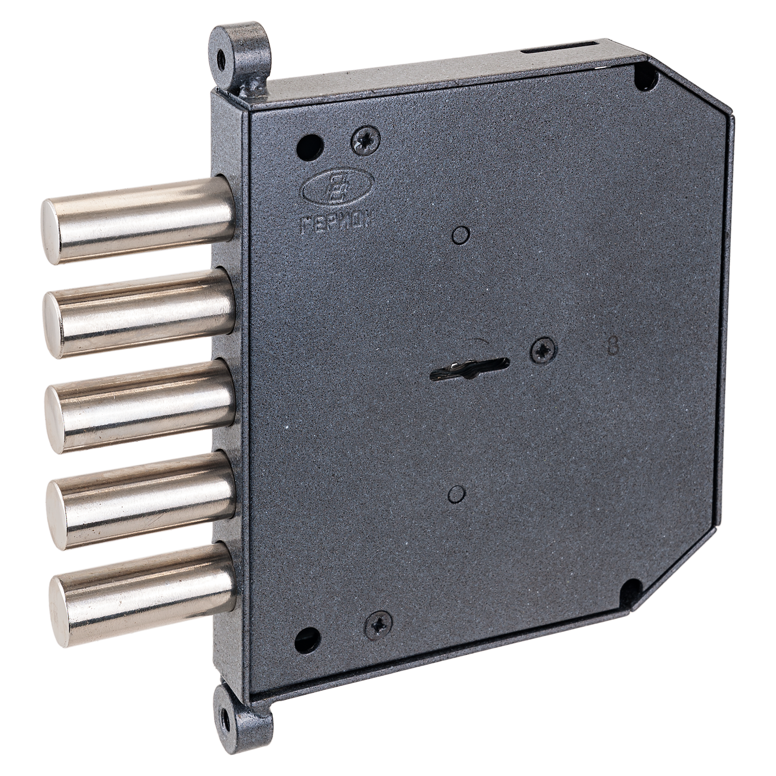 Запирание поворотом ключа, обеспечивает ригель, имеющий 5 пальцев, диаметром 17мм., с вылетом 42мм.