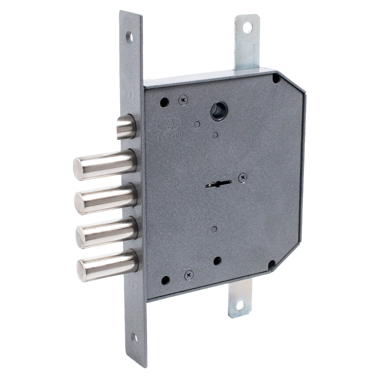 Запирание поворотом ключа обеспечивает ригель, имеющий четыре пальца диаметром 17 мм с вылетом 42мм. Дополнительные тяги имеют ход 20 мм и обеспечивают запирание двери вверху и внизу. Защелка обеспечивает фиксацию двери и приводится в действие ручкой.