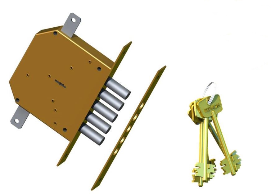 Замок врезной с пятипалым ригелем и двумя дополнительными тягами. Имеет 8и-сувальдный блокирующий механизм сейфового типа.