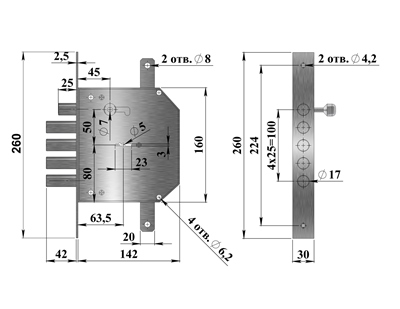 Замок врезной с четырехпалым ригелем, засовом типа «карабин» диаметром 17 мм с вылетом 23 мм, двумя дополнительными тягами и 8и-сувальдным блокирующим механизмом сейфового типа. Замок сертифицирован 3 классом по ГОСТ 5089-2011, сохраняет работоспособность после попадания в скважину посторонних предметов. Запирание двери в трёх направлениях обеспечивает повышенную сопротивляемость к взлому и высокую степень защиты. Выпускается правого и левого исполнения. Толщина корпуса замка 24 мм. Основной засов, состоящий из четырех пальцев диаметром 17мм, имеет вылет 42 мм и приводится в действие с помощью ключа, дополнительные тяги имеют ход 20 мм и обеспечивают запирание двери вверху и внизу. Внутренний затвор работает по типу затвор «карабин».