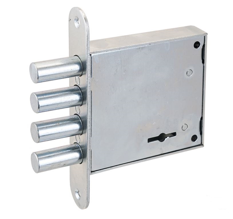 Четыре цилиндрических ригеля, диаметром 14мм. Вылет ригелей 34мм. Удаление ключевого отверстия 65мм. Стальная торцевая планка, покрытие — цинк, ширина планки 27мм.