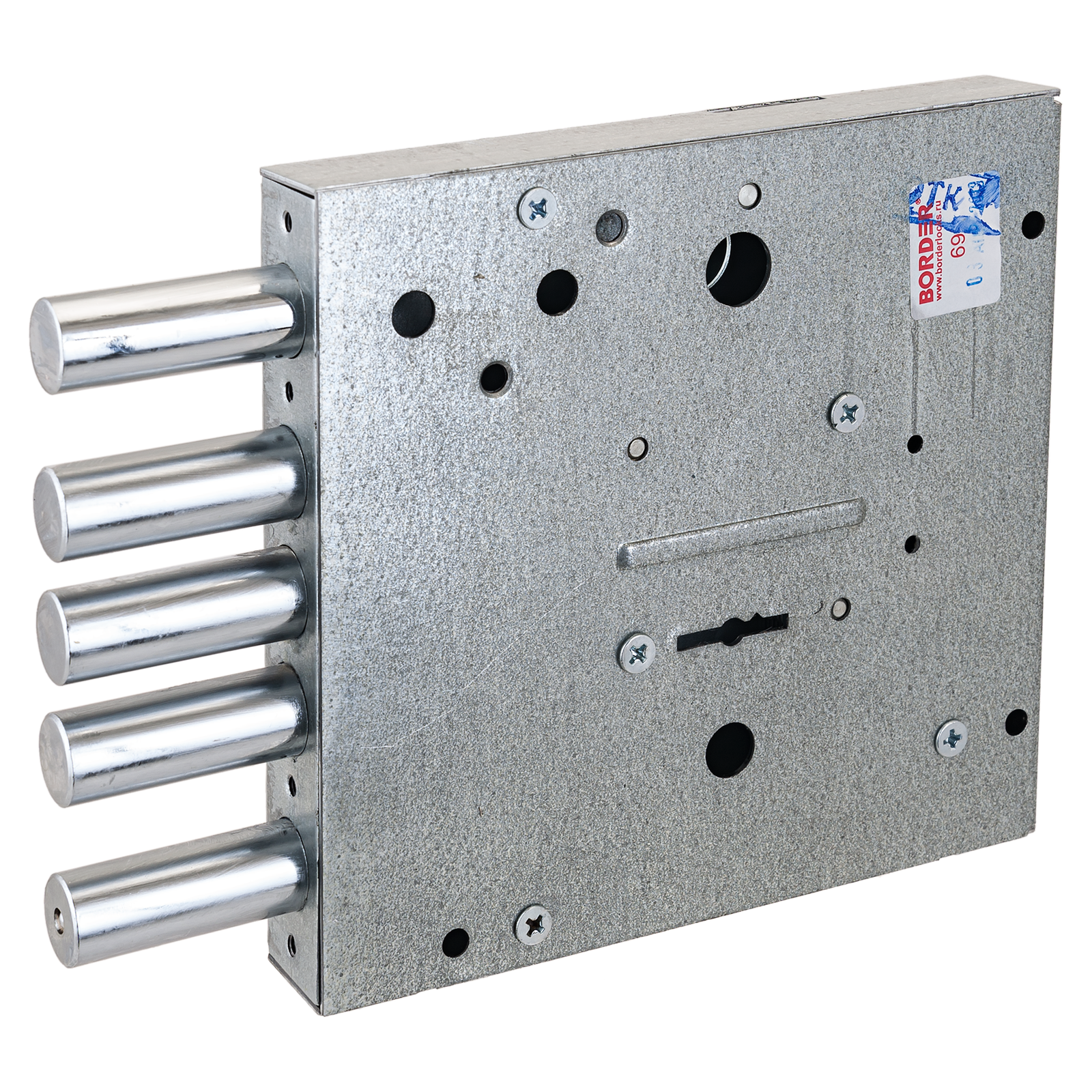 Замок врезной сувальдный для металлических дверей. Засов из пяти цилиндрических ригелей диаметром 15,7 мм, с максимальным вылетом 39,5 мм. Удаление ключевого отверстия 80 мм. Габариты замка — 150х144х28мм. Комплектация — 5 ключей. Броненакладка особой формы (с отверстием под ключ) из высококачественной каленой стали защищает не только сувальдный механизм, скрытый в корпусе замка, но и служит дополнительной защитой при попытке вскрытия двери «свертышем». В одном из ригелей расположен закаленный стальной стержень, обеспечивающий надежную защиту от перепиливания.