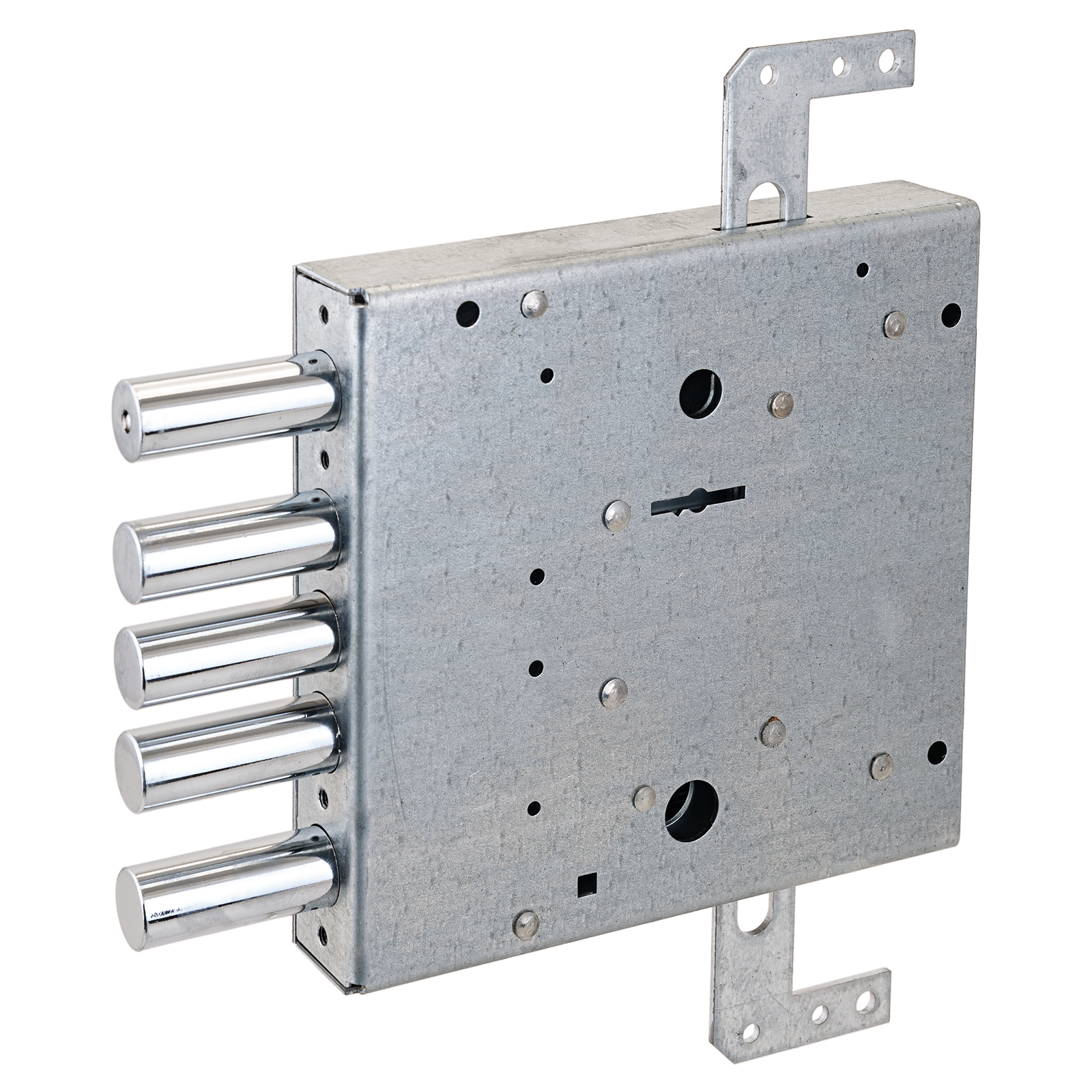 Замок врезной сувальдный с тягами для металлических дверей. Засов из пяти цилиндрических ригелей диаметром 15,7 мм, с максимальным вылетом 39,5 мм. Удаление ключевого отверстия 80 мм. Габариты замка — 150х144х28мм. Комплектация — 5 ключей. Броненакладка особой формы (с отверстием под ключ) из высококачественной каленой стали защищает не только сувальдный механизм, скрытый в корпусе замка, но и служит дополнительной защитой при попытке вскрытия двери «свертышем». В одном из ригелей расположен закаленный стальной стержень, обеспечивающий надежную защиту от перепиливания.
