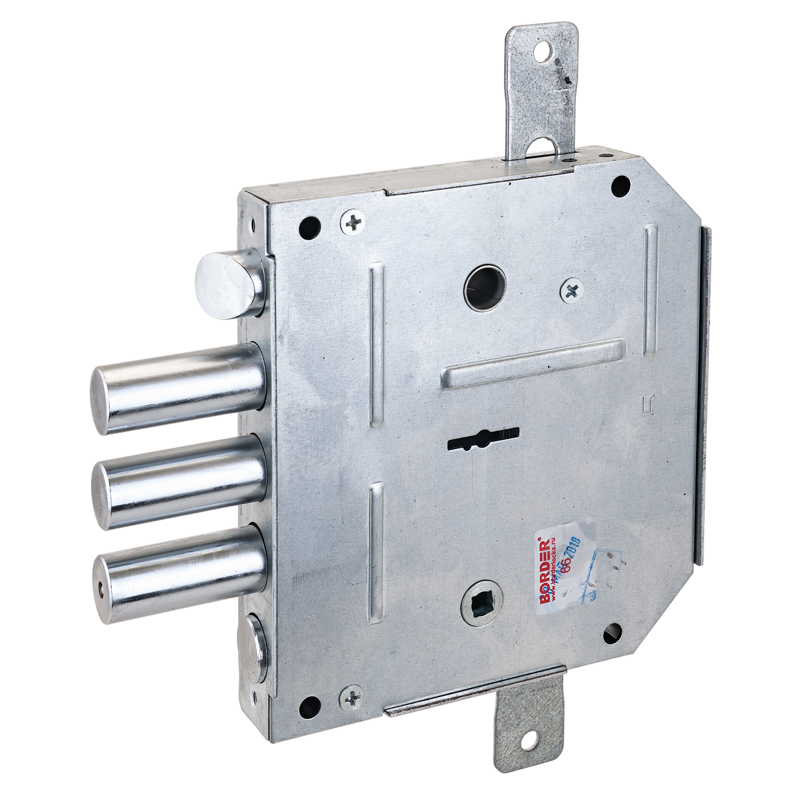 Замок врезной сувальдный с защелкой, задвижкой и тягами. Предназначен для металлических дверей. Засов из трех цилиндрических ригелей диаметром 17,7 мм, с максимальным вылетом 40 мм. Вылет задвижки — 24,5мм. Удаление ключевого отверстия 65,5 мм. Межосевое расстояние до защелки — 42мм, до задвижки — 47мм. Габариты замка — 137х145х30мм. Комплектация — 5 ключей.